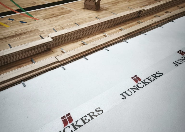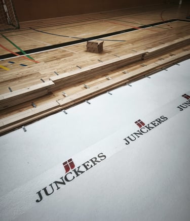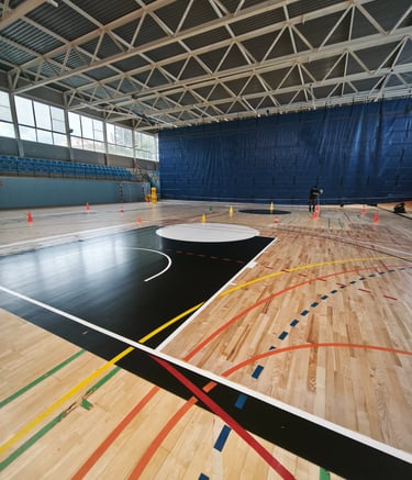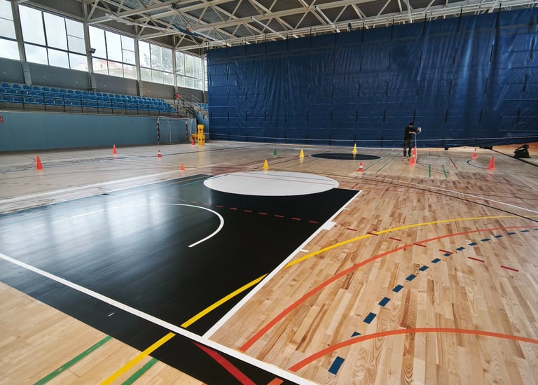 Instalación de suelos de madera y pavimentos sintéticos para instalaciones deportivas. Reparaciones y mantenimiento de pistas y líneas.